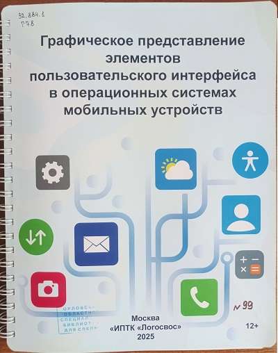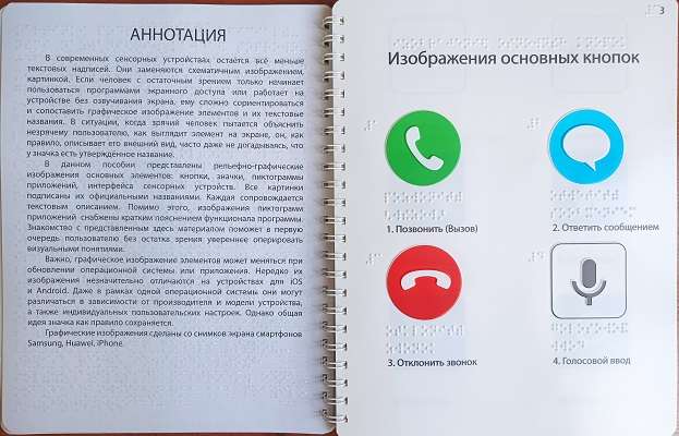 — «Графическое представление элементов пользовательского интерфейса в операционных системах мобильных устройств». Представлены в пособии рельефно-графические изображения основных элементов: кнопки, значки, пиктограммы приложений, интерфейса сенсорных устройств. Все картинки подписаны в соответствии с их официальными названиями. Каждая сопровождается текстовым описанием. Знакомство с представленным здесь материалом поможет в первую очередь пользователю без остатка зрения увереннее оперировать визуальными понятиями;